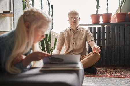 Stock photo of two caucasian homosexual men sitting crossed legged next to each other meditating. They have their eyes closed.