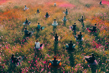 A diverse group of individuals standing together in a vibrant field of colorful flowers, enjoying the natural beauty around them, Aerial view of people practicing yoga in a flower field, AI Generated