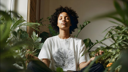 Image of a person in serene meditation among verdant plants, focusing on mental wellness