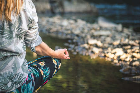 Woman doing yoga on the stone at the mountain river. Carpathians