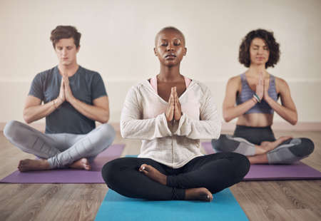 Feeling centred. Full length shot of a diverse group of yogis sitting together and meditating after an indoor yoga session.