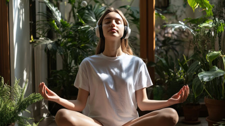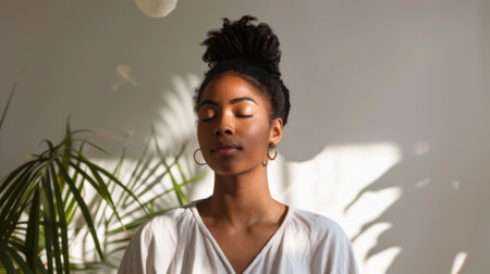 Woman with closed eyes enjoying peaceful meditation indoors, surrounded by natural light and greenery, embodying tranquility and mindfulness
