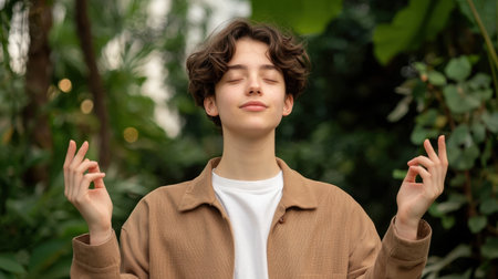 A calm young person sits peacefully in a lush green environment, practicing mindfulness. This serene moment captures the essence of tranquility and self-awareness.