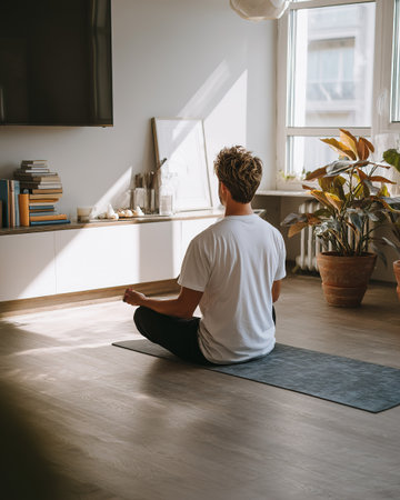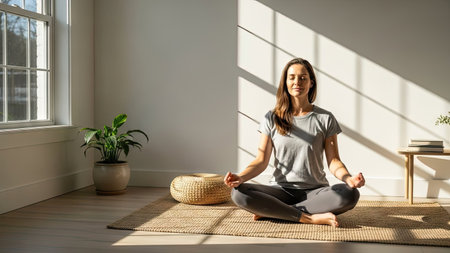 A woman sits in a meditative pose indoors with her eyes closed, bathed in sunlight. The scene features a neutral color palette, emphasizing the natural light and shadow play. The composition includes a window, a houseplant, and simple decor, suggesting a calm and peaceful environment suitable for various commercial applications or editorial content.