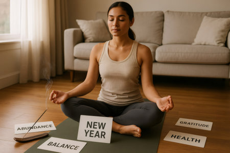 Young woman practicing yoga and meditation at home with incident and intention cards for new year resolutions