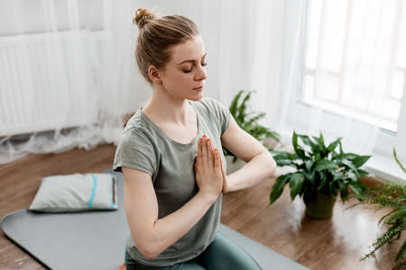 Beautiful brunette fitness woman meditate, doing yoga indoors at home. Staying fit and healthy