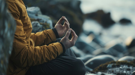 A person engages in breathing exercises in a calm, outdoor setting to promote stress relief and relaxation while surrounded by serene atmosphere