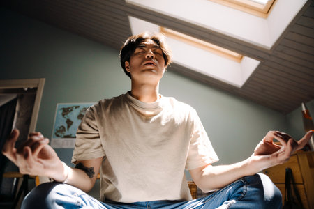 Young asian man wearing t-shirt meditating while sitting on bed at home