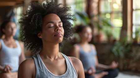 A serene woman meditates in the foreground, surrounded by other women who share a tranquil atmosphere and focus on mindfulness practice.
