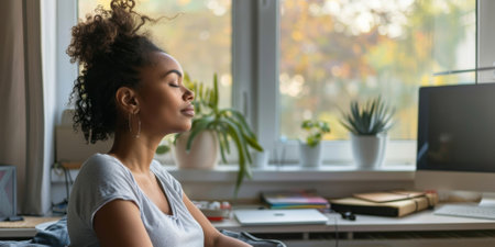an African American woman doing a quick morning meditation session in her home office before starting work