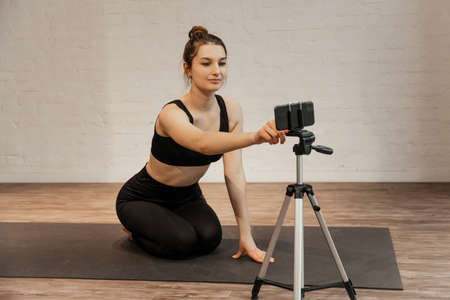 Young blonde girl getting her long hair braided by woman hairdresser before sport training while looking at cell phone with mockup screen and sitting on floor at home or fitness studio