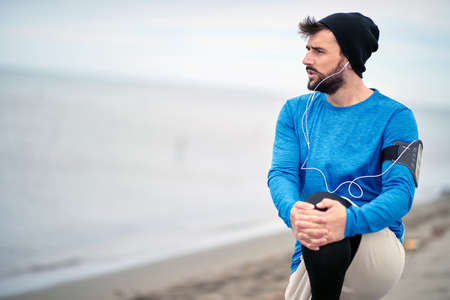 Active man stretching out before exercising in a street workout park on a cloudy winter day