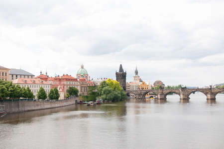 The image of the old part of Prague. In the central part of the Charles Bridge in the background of a beautiful reflection of the Vltava River.