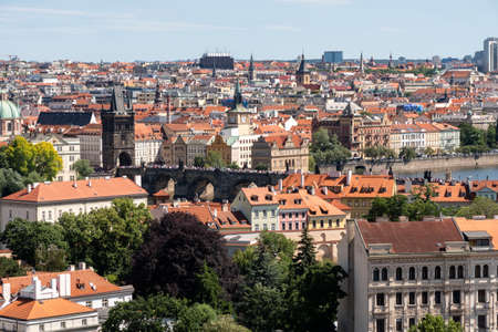 The cityscape with old tile roofs, palaces, townhouses and Cech Bridge on Vltava River, Prague, Czech Republic