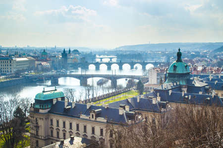 view of Prague and its bridges crossing the Vltava river