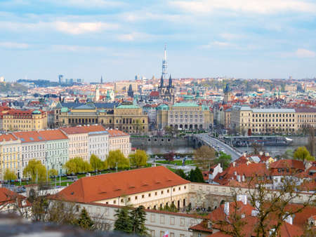 Prague, Czech republic - april 2019: Ancient Prague Castle from a birds perspective. View on Moldau river, television tower, top of Old Town Square, colorful roofs of buildings. Vintage architecture