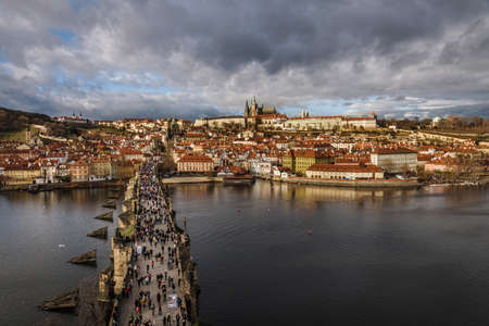 Prague, Czech Republic - October 8, 2017: Top view on ancient Charles Bridge crosses Vltava river in Prague. Tourists are walking Charles Bridge Prague, Czech Republic.
