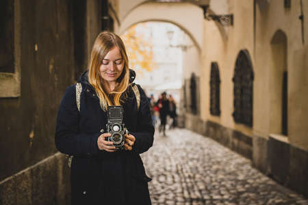 A blonde girl in a coat is focusing and taking pictures with a vintage twin lens camera. Some tourist in the background of the passage.