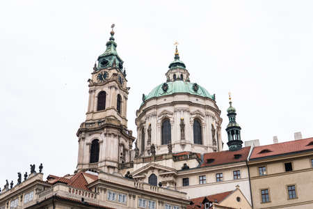 Prague with St. Nicholas Church, Mala Strana (Lesser Town of Prague) through the arch of the Malostransky tower. View of colorful old town.