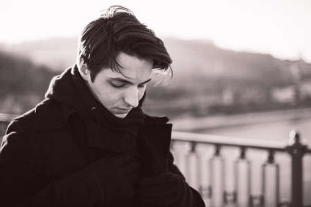 One handsome young man in urban setting in moden city, standing, wearing black coat and scarf in winter day