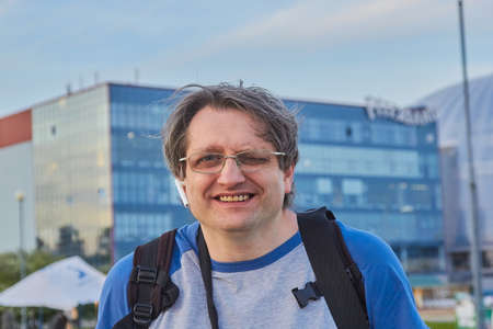 Kirov, Russia - September 04, 2019: Portrait of a handsome fun man sitting on the asphalt on a city street in a summer, spring or autumn day