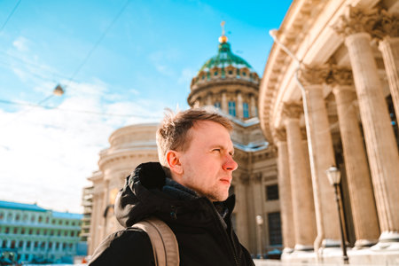 A young man walks in the center of St. Petersburg, past the Kazan Cathedral on a frosty sunny day in winter
