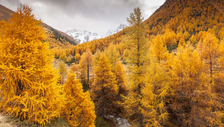 Sunny autumn day in Alpine mountains. Yellow larches in backlight