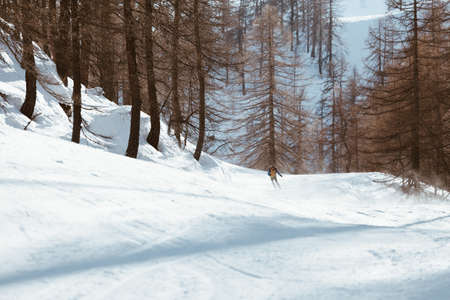 Skier skiing down the slope in the forest - Downhill in high mountains.