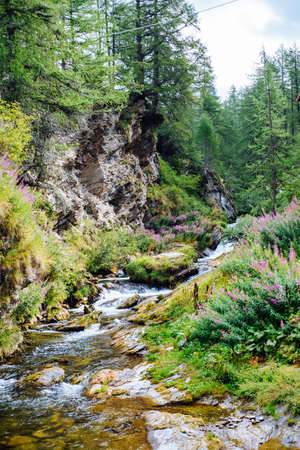 mountain river in the forest in summer, alpe Devero, Piedmont, Italy