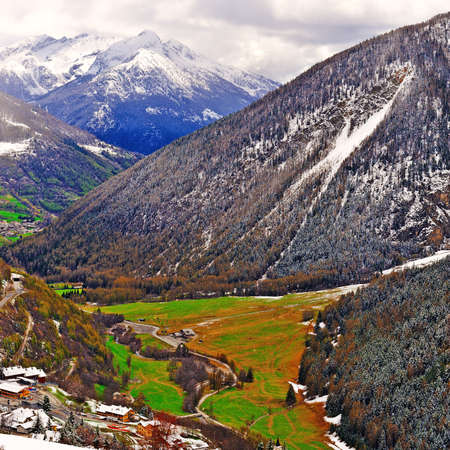 Alpine landscape compresses snowfall in autumn between the Italian and Swiss Alps