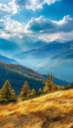 Stunning high-quality panoramic landscape photo of sunny day in autumn mountains