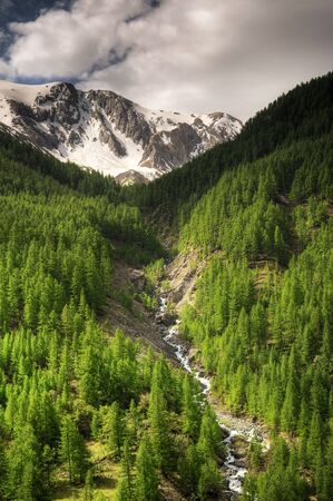 Rocky mountain river among the pine trees. Beautiful fast-flowing river in the coniferous forest. The wild nature of Altai.