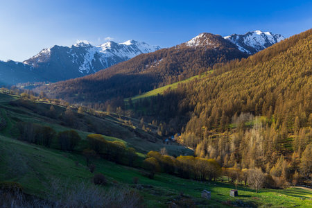 Golden sunlight warming snow frosted peaks and woodland landscapes of aosta valley, capturing tranquil autumn mountain scenery in northern italy Lillaz