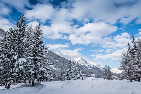 Winter landscape of mountains and sunny day. French alpines. Free space for your decoration.