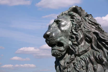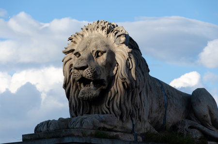 Lion sculpture on Chain Bridge in Budapest, capital city of Hungary, Europe. Detailed shot on blue sky background.