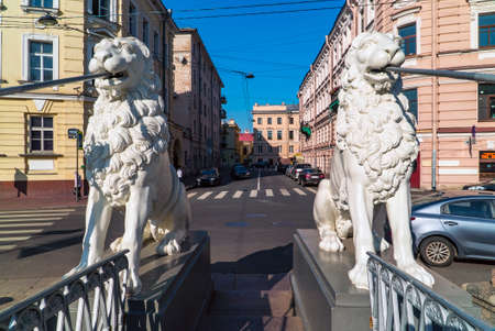 Russia, St. Petersburg 30,03,2019 The Lion Bridge in St. Petersburg. White iron lions of the bridge support. The historic beautiful bridge is a tourist attraction.