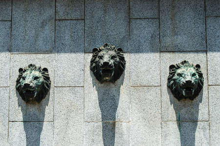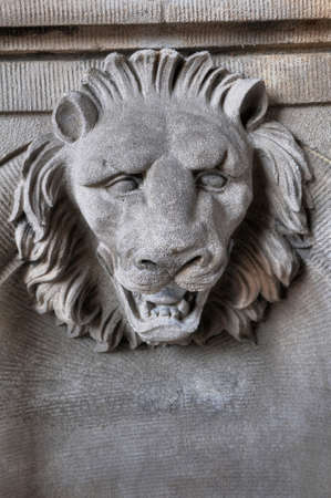 closeup large lion head sculptured from stone symbolises city of Lviv armorial bearings