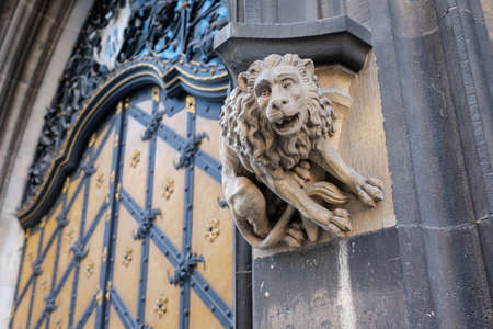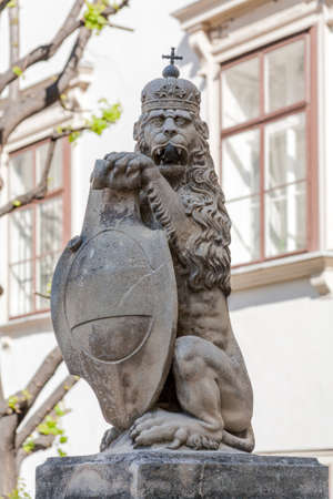 Bronze sculpture of lion on the yard of Strahov Monastery in Prague, Czech Republic