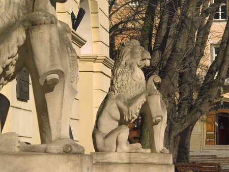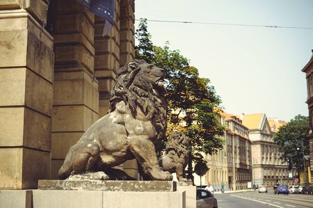 Ukraine, Lviv, historical lion sculpture, symbol of the city