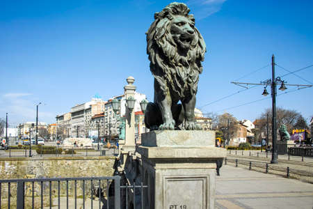 SOFIA, BULGARIA - FEBRUARY 25, 2022: Panorama of Lion's Bridge over Vladaya river, Sofia, Bulgaria