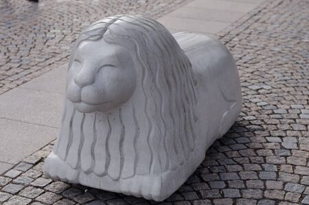 Stockholm, Sweden - April 30 2018. A concrete lion named Stockholmslejon designed by Anders Ã…rfelt, to stop traffic at Raoul Wallenbergs square.