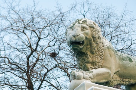 Historical center of tourism. Hungary. Budapest. A large stone lion, growls open its mouth