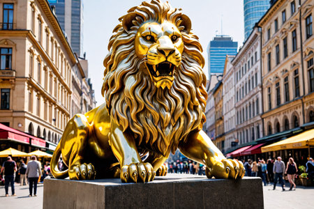 A regal lion displays its fierce gaze in a bustling city backdrop.