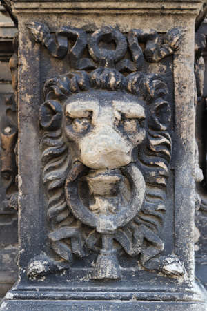 Architectural detail in the form of lion’s muzzle. Ancient architecture. Ruins of temples and castles sooty from age. Damaged by time