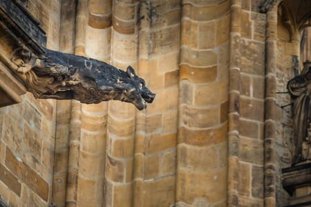 Czech architecture, scary gargoyle sculpture, gothic temple decoration. Medieval art, mystic gargoyle monster statue, St. Vitus Cathedral.
