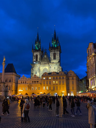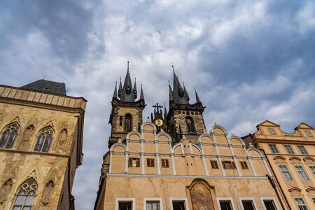 Tyn Church seen from plaza near Stupartska Street in Old Town, Prague, Czech Republic