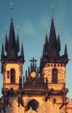 Famous Tyn Cathedral Twin Tower at night illuminated on Prague Town Square Czech Republic Europe