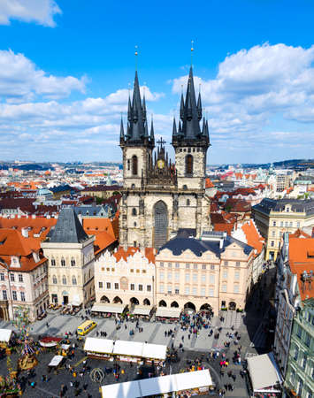 Aerial view of Church of Our Lady before Tyn at Old Town Square, Prague, Czech Republic.