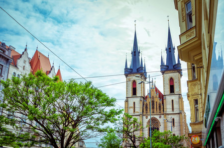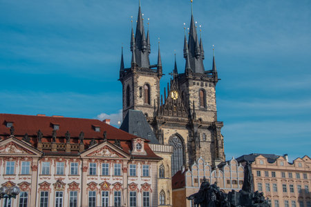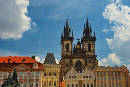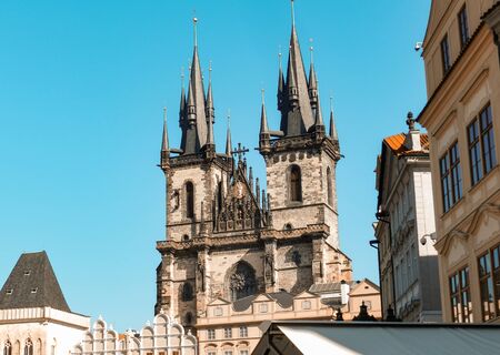 Prague, Czech republic. Church of Our Lady before Tyn. Grand cathedral in the midtown of the old town, famous travel destination. Sunny day, blue sky with clouds