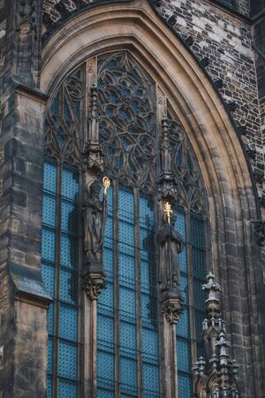 Decal window transparency inside the cathedral of St Vitus in Prague, a church with dark Gothic towers guarded by gargoyle: the main religious symbol of the Czech Republic